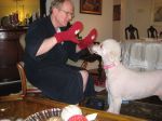 (Here's Ted, ay 7 this morning, wearing his new Olympic mittens. Chloe is interested too!)